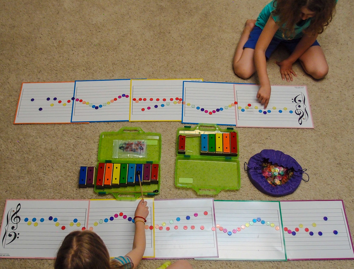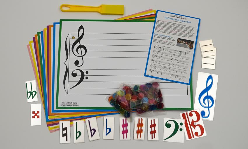 The folding staff slate includes one double-sided slate with a rainbow border as well as clear transparencies with clefs, sharps, flats, etc. The folding staff slate is cut in the middle to fold for convenient storage and transportation inside the Puppy Packet.