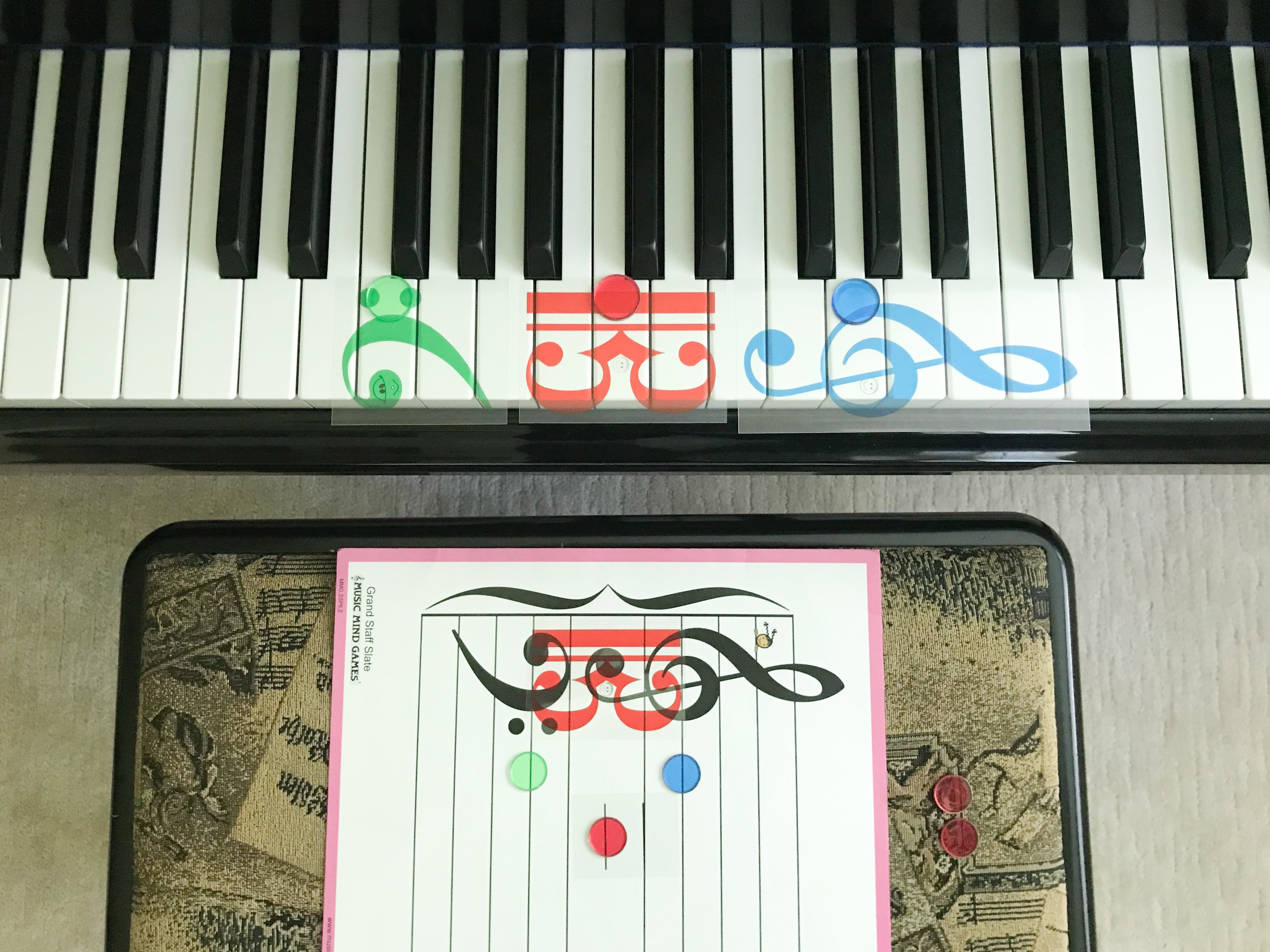 - Side 1: The grand staff has printed clefs and only enough space for the three notes (B, Middle C, and D) found between the clefs to make it easy for students to learn the relationship between the two staves